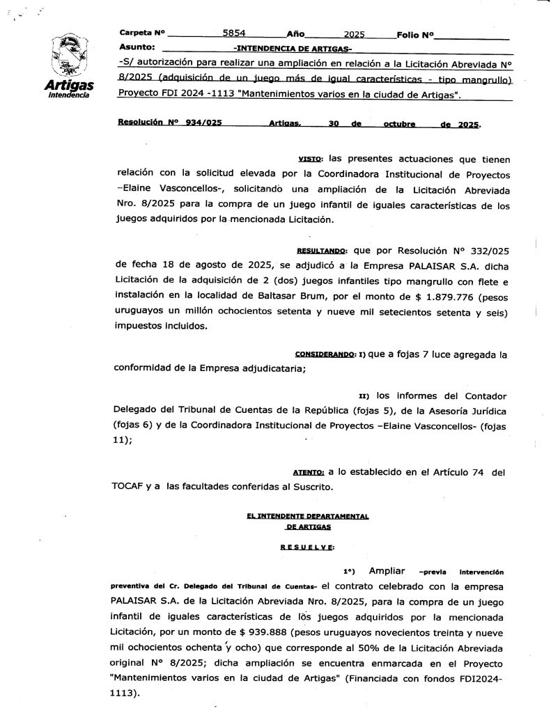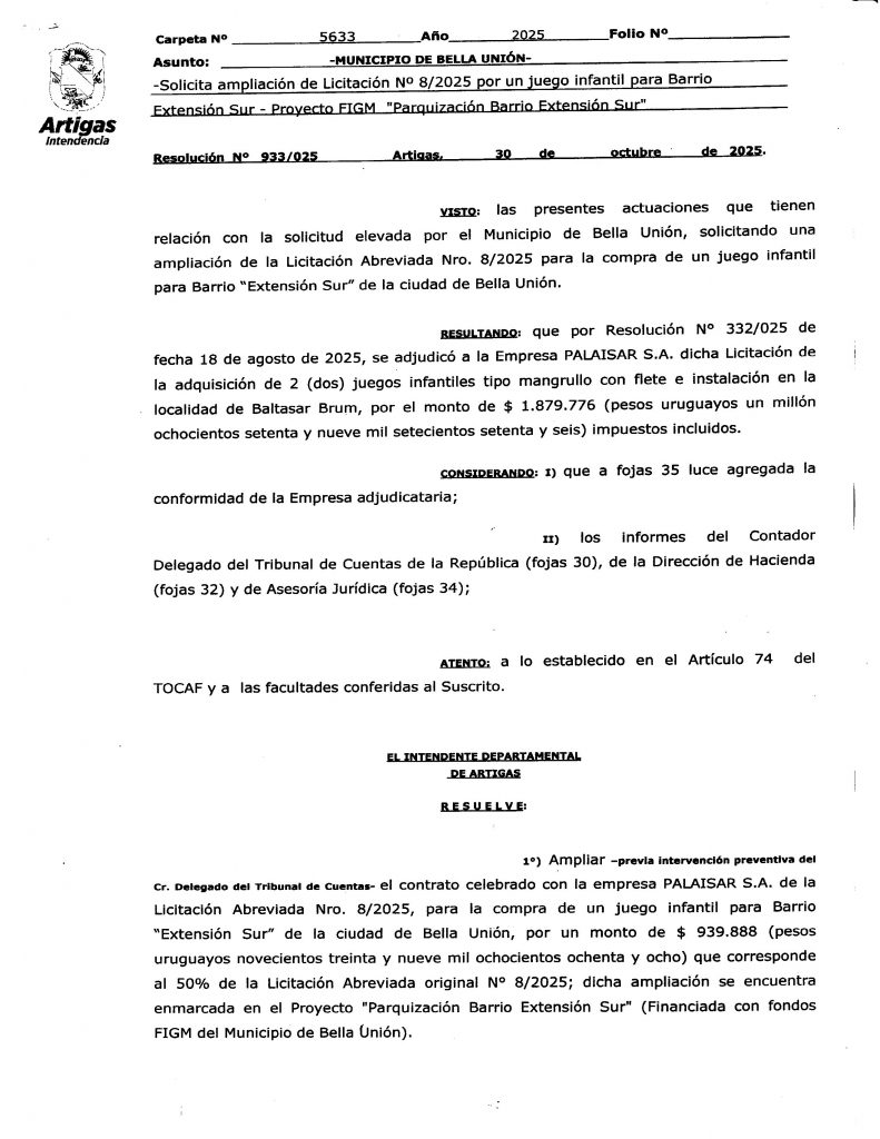 MUNICIPIO DE BELLA UNIÓN - Solicita ampliación de Licitación N°8/2025 por un juego infantil para Barrio Extensión Sur - Proyecto FIGM "Parquización Barrio Extensión Sur". Res.933-025_-_30_de_octubre_-_Expte.5633-2025Descarga