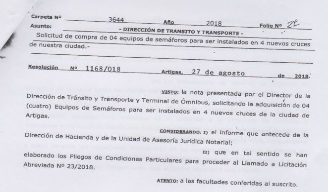 RESOLUCIÓN 1168/018 SOLICITUD DE COMPRA DE 4 EQUIPOS DE SEMÁFOROS PARA SER INSTALADOS EN 4 NUEVOS CRUCES 28 agosto, 2018 | No hay comentarios Visto: la nota presentada por el Director de la Dirección de Tránsito y Transporte y Terminal de Ómnibus, solicitando la adquisición de 4 (cuatro) equipos de semáforos para ser instalados en 4 nuevos cruces de la ciudad de Artigas. Categories: NOTICIAS