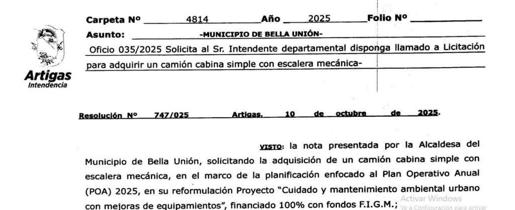 Resolución N° 747/025 14 octubre, 2025 | No hay comentarios Oficio 035/2025 Solicita el Sr. Intendente Departamental disponga llamado a Licitación para adquirir un camión cabina simple con escalera mecánica. Res.747-025_-_10_de_octubre_-_Expte.4814-2025Descarga Categories: ARTIGAS, DECRETOS y RESOLUCIONES, LICITACIONES