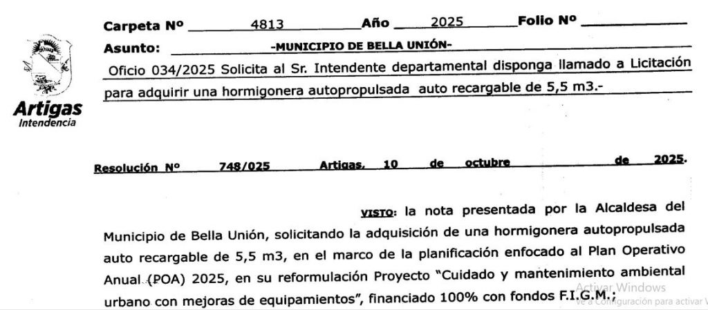 Resolución N° 748/025 14 octubre, 2025 | No hay comentarios Oficio 034/2025 Solicita al Sr. Intendente Departamental disponga llamado a Licitación para adquirir una hormigonera autopropulsada auto recargable de 5,5 m3. Res.748-025_-_10_de_octubre_-_Expte.4813-2025-1Descarga Categories: ARTIGAS, DECRETOS y RESOLUCIONES, LICITACIONES