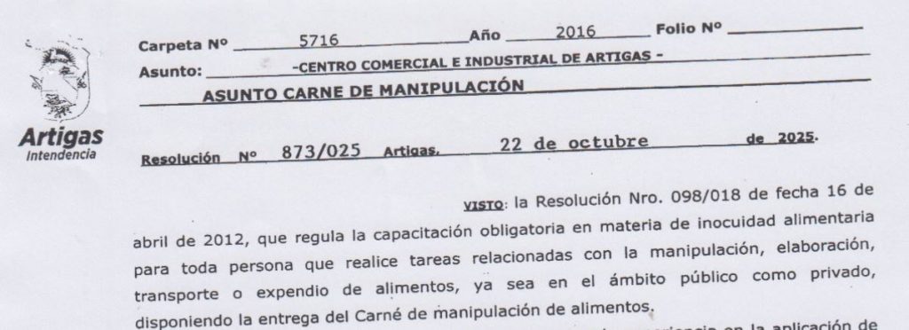 Resolución N°873/2025 24 octubre, 2025 | No hay comentarios CARNÉ DE MANIPULACIÓN RESOLUCION 873 2025Descarga Categories: ARTIGAS, DECRETOS y RESOLUCIONES, LICITACIONES