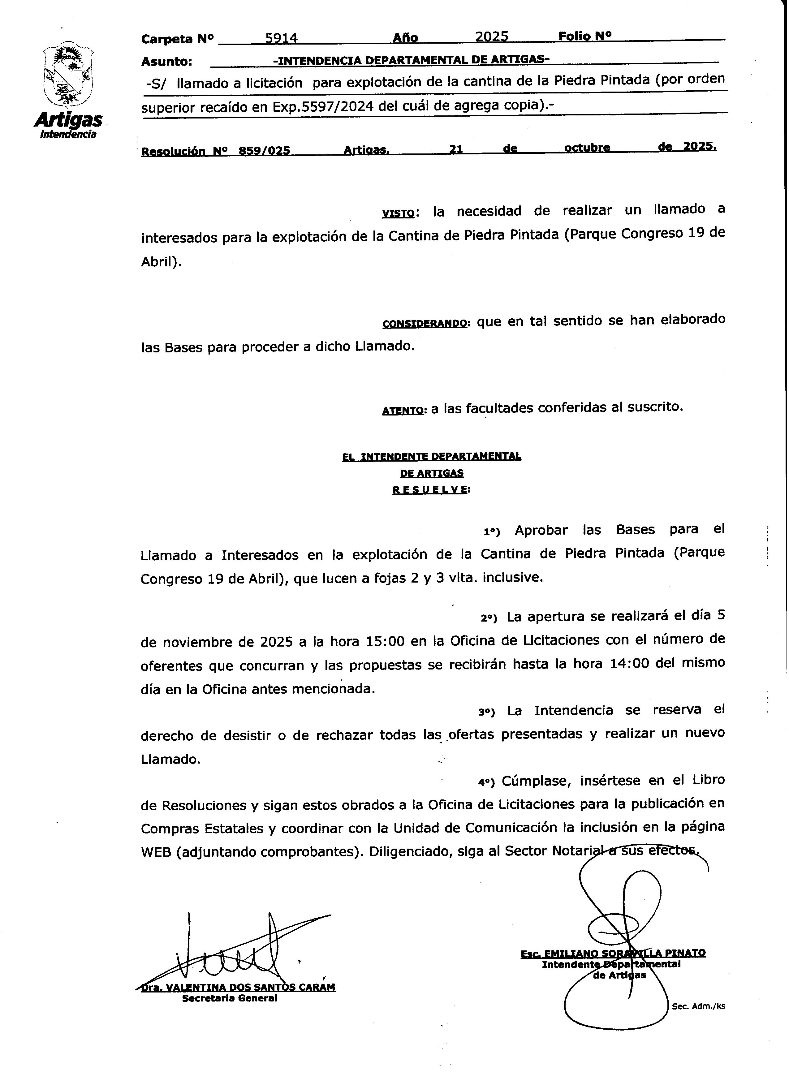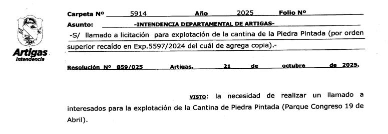 Resolución N°859/025 4 noviembre, 2025 | No hay comentarios S/ llamado a licitación para explotación de la cantina de la Piedra Pintada (por orden superior recaído en Exp.5597/2024 del cuál se agrega copia).- Res.859-025_-_21_de_octubre_-_Expte.5914-2025Descarga Categories: ARTIGAS, DECRETOS y RESOLUCIONES, LICITACIONES