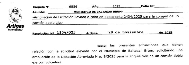 Resolución N° 1154/2025 8 diciembre, 2025 | No hay comentarios MUNICIPIO DE BALTASAR BRUM – Ampliación de Licitación abreviada a cabo en expediente 2434/2025 para la compra de un camión doble eje. Res.1154-025_-_28_de_noviembre_-_Expte.6556-2025Descarga Categories: ARTIGAS, DECRETOS y RESOLUCIONES, LICITACIONES