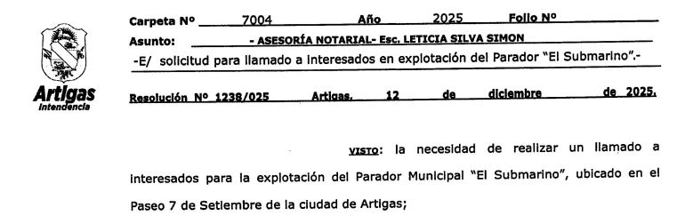 Resolución N° 1238/025 19 diciembre, 2025 | No hay comentarios LLAMADO A INTERESADOS EN EXPLOTACIÓN DEL PARADOR EL SUBMARINO Res._1238-2025_-_12_de_diciembre_-_Expte_7004-2025Descarga Categories: ARTIGAS, DECRETOS y RESOLUCIONES, LICITACIONES