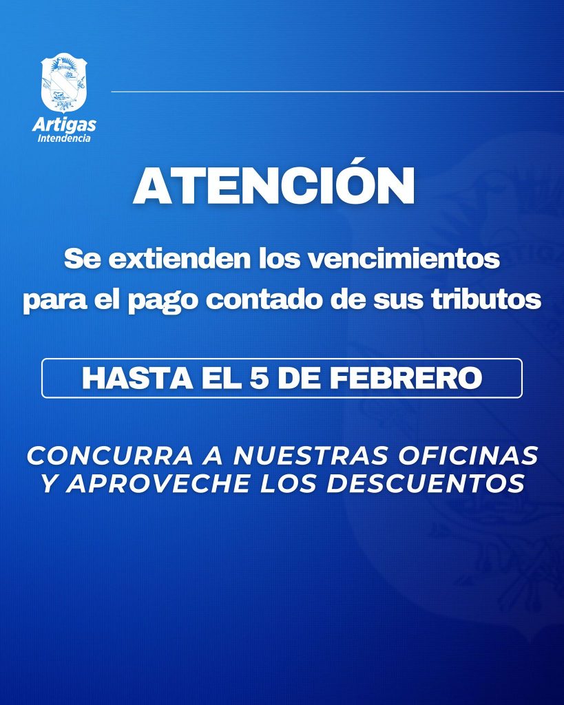 Resolución N°1398/026 21 enero, 2026 | No hay comentarios Se extienden los vencimientos de pago para Contribución Rural, Permiso de Circulación y Contribución Urbana.Aproveche nuestros descuentos 15% pago al contado+10% buen pagador . RESOLUCION 1398 026Descarga Categories: ARTIGAS, DECRETOS y RESOLUCIONES, LICITACIONES